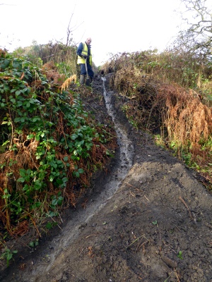 The first team also undertook an investigation to determine why water was flowing down a hillside and across a footpath in an area that used to be dry. Two field drains from the adjacent farmland were found disgorging water and this was what was causing the problem but now a remedy has to be found.
