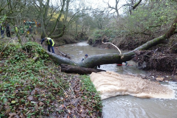 Then two teams, one on either side of the river, moved upstream clearing gullies, soak-aways and pipes, as well as clearing the top branches of a tree which had fallen across the footpath.