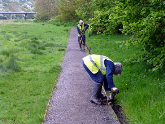 Meanwhile the two remaining volunteers had been tasked with checking and clearing all the drainage gullies we had created last winter in an attempt to keep the west side path from flooding and subsiding from the effects of the mine water leakage. Clad in Wellington boots they soon became covered in mud and the sickly brownish sludge that had accumulated in some of the gullies.