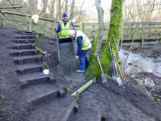 From there the group went on a cleaning spree along the south bankside path clearing the winter deposit of soil and leaves from the various short flights of steps and ensuring the drainage channels were clear.