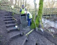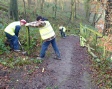 Adjacent to the bridge, the start of the path is a short sharp descent next to the steps, which few people like or use. The first task was to fix two wooden battens across the path to try and eradicate stone slip on the descent in rain or normal use. At the same time other volunteers were clearing the soft mud down to the original stone along the path while others were wheel barrowing new stone from the pile some distance downstream and on the opposite side of the river: an extremely exhausting trek.