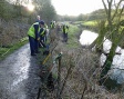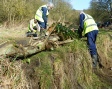 Meanwhile the other group, in the same area, were putting in wooden revetment on areas of the river bank, which were being worn away by dogs using them for access to and from the water, thereby putting the path itself in danger of erosion. Normally the materials we use are recycled short posts and rails but on the north side of the river large logs were used to cover a wider area where bank erosion and potential major path erosion, is a much bigger problem. Luckily a small ivy covered tree nearby had been brought down by the recent gales and the trunks of this tree were used as a barricade held in place by posts and stapled wire.
