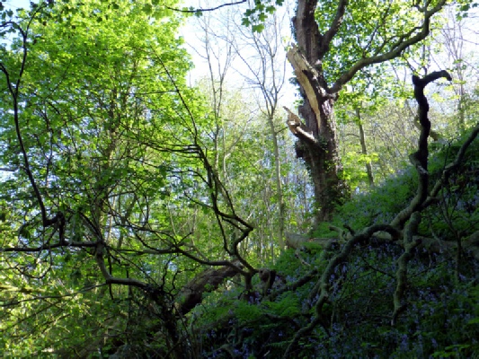 It was early in May 2014 that an ancient ash tree split its trunk and half the tree fell onto the hillside with its uppermost branches across the adjacent footpath. The volunteers cleared the lighter branches and opened the footpath but the fallen trunk broke into a number of pieces, which remained balanced on the steep hillside above.