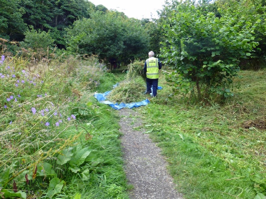 There were plenty of walkers with and without dogs, a couple of mums with buggies, joggers and the usual cyclists. The great majority are cooperative and appreciative, controlling dogs, happy to pause for a short time while machine operators cease work and cyclists slow down. Then we have the minority, those refusing to put their dog on a lead or cyclists refusing to slow down and giving a thunderous look to the person strimming – that is our country! Anyway, there were no accidents and we even managed to avoid strimming the orchid that had been found on the edge of the path.