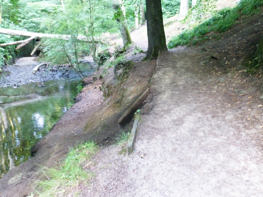 This path, together with its very necessary wood edging, was put in about 13 years ago. As can be seen in the photograph some of the timber had rotted and broken away allowing the path edge to start crumbling and falling down the steep bank into the river.