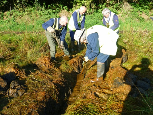 In the last hour of the morning a real effort was made to straighten and deepen the main outflow of mine water and to try and build up a bank with the excavated mud to stop the water meandering into and flooding the lower adjacent areas. Photograph 3 shows this work in progress.