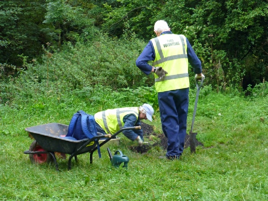 The seat overlooking the stepping-stones, so loved by parents watching their offspring having fun on the stones or in the river, had been vandalised by, it is thought, heavy kicking during the early part of the school holidays. A new seat had been prepared by one of the volunteers and was put together on site, while the remains of the old supports were removed. Holes were dug for the new supports and the photograph shows this happening as well as confirming that there is no sexism in FoHD!