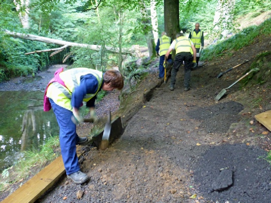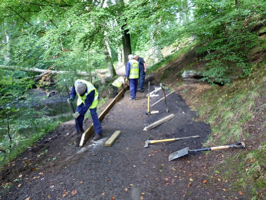 While this was ongoing, other volunteers were barrowing stone down from the old railway line above, where luckily we had a pile left over from a previous job. The second photograph shows the old wooden edging being removed while to the right of the picture can be seen some of the transported stone.
