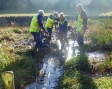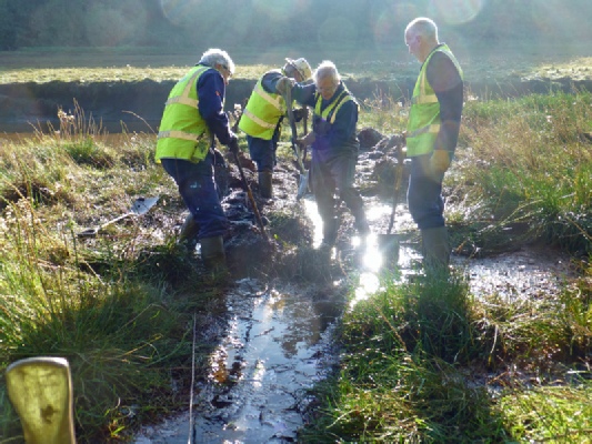 By the end of the morning the whole area was showing signs of drying out and water was flowing in vast quantities into the river. However, only time and a few high tides will tell us if our morning’s work has done any long term good. We were thankful that no one fell over or sat down during the morning’s work but everyone was well-splashed: the colour and lingering smell of the yellow/brown water extremely difficult to remove.