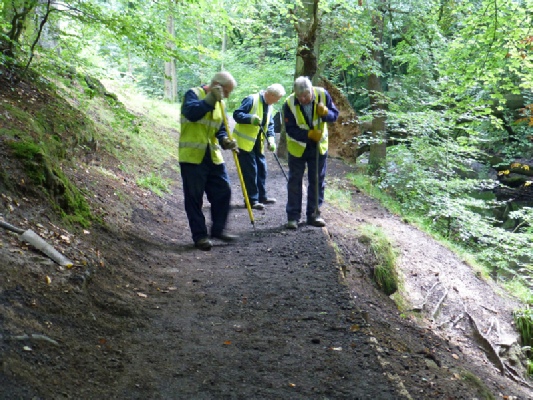This riverside path is very popular with walkers and so it was today. Where we were working was very narrow with a sharp almost vertical drop down to the river. It is pleasing to report that today no body or tool ended in the wet (only my camera case) and we were overwhelmed by the praise for our work received from the passing walkers.