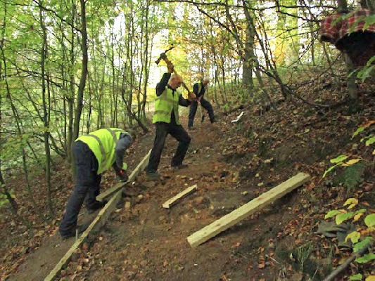 A rather depleted working party of six met today to carry out path repairs upstream between the two bridges. The weather was damp but mild for late October. The path was covered in fallen sycamore leaves and the atmosphere in the Dene was calm and tranquil.
