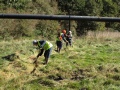 Team 4 set about the more technical task of the day replacing a fence which has been broken a number of times. Since the council built a kissing gate at the point where the path coming from the Holywell road bridge meets the Waggonway, breaking the fence has given cyclists a quicker exit. The old damaged posts and fence were dismantled and the area prepared for the construction of the replacement using the posts salvaged by team 3. Holes were dug and to provide extra strength and stability, posts were cemented in with rapid setting cement. Rails were put in place and the pièce de résistance, in the form of rigid metal mesh, was attached. The construction is lower than the previous one, so hopefully cycles will be lifted over it rather than breaking down another area of fence.