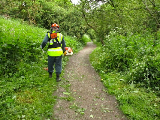 Once loaded up, with our safety gear on, we set off to the areas that needed our attention. The first area was the sloping path near the stepping stones that takes you up to the top road (the “M1”). One pair started at the bottom of the incline, another went to the top, and the last pair strimmed along the bottom pathway. The seventh person used the hedge cutter to remove branches that were obstructing the pathways.