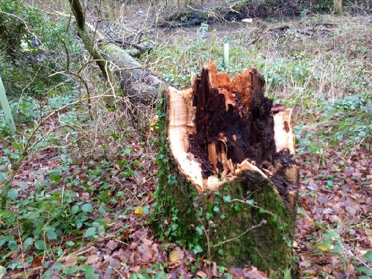 This big oak is another sad loss. It was one of the only two mature oaks your correspondent knows of in the lower Dene – the part downstream of the tunnel. Its trunk had broken off about a metre above ground level, and examination of the stump revealed that it had been weakened by a black rot.