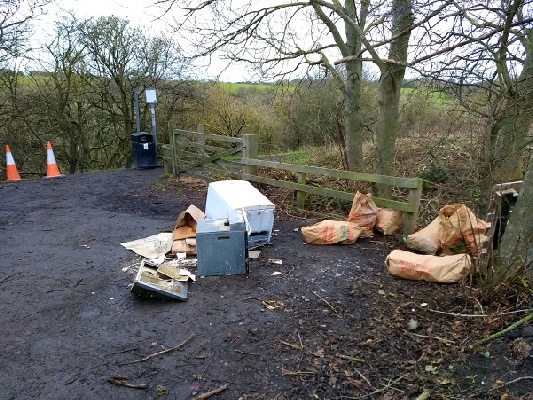 Fly-tipping. This seems to be the fly-tipping season, and stuff has been dumped at the layby and the Hartley Lane carpark. Here’s the mess in the carpark: