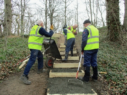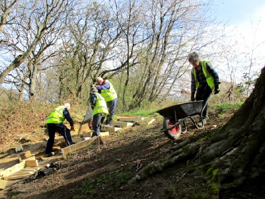 Holywell water pumping station was the assembly point for the eleven volunteers of the working party this morning, and the task of the day was installing a flight of steps in a steep section of the footpath network near the informal mountain bike park. The day was dull and chilly, but the rain held off, so conditions were good for task work.