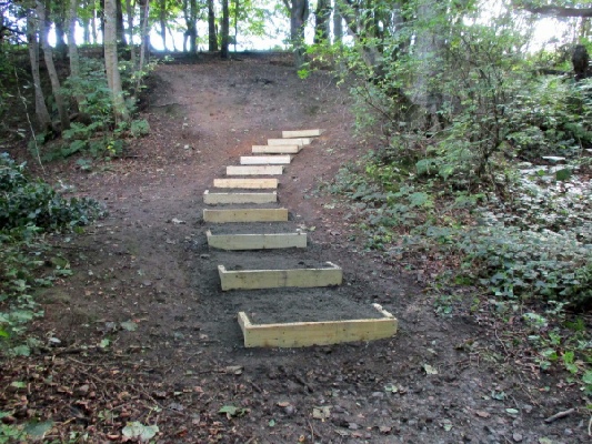 Well, partly because of the expenditure of effort on wheelbarrowing, it was only possible to put eleven steps in today (see photo). Nevertheless we got a few “thank-yous” from passers-by, although not so many from mountain-bikers who seem to enjoy going up and down these steep slopes – but they can still pass either side of the steps.