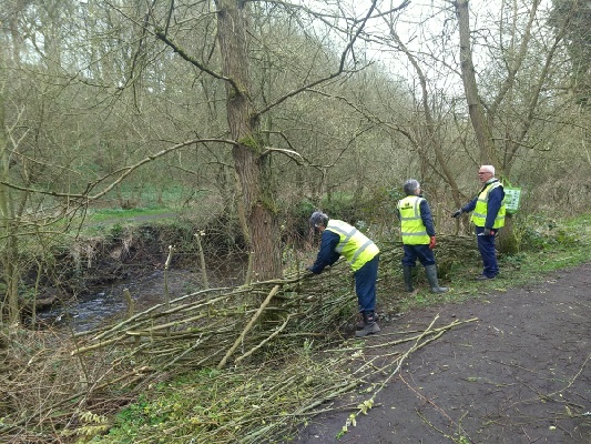 Willow-weaving was again the theme of this morning’s working group session at the gabions upstream of the stepping stones. Seven volunteers assembled close to Hartley West Farm on a grey but dry day.