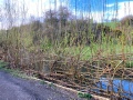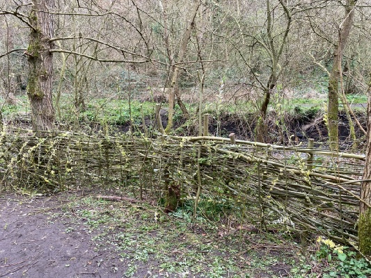 The cut stems were then used to construct a willow barrier to block off a doggie-slide. Some thicker stems were cut to a suitable length and pushed into the soil of the river bank. These verticals were then inter-woven with thinner willow wands to produce a basket-like effect.