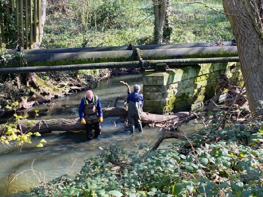 A working party of nine volunteers gathered near Hartley West Farm this morning for another river clearance session, on a fine sunny day – with birds singing and spring flowers blooming.