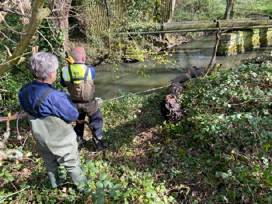 So, we got the loppers out and a long-handled pruner and started work. One of us got into the river with waders on to tackle the overhanging branches.